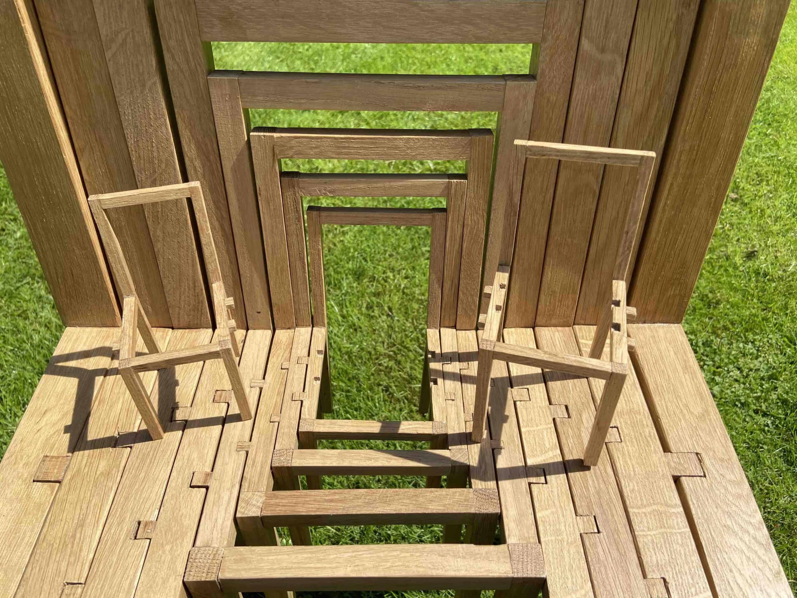 En uitsparingen gaan beitelen waar de stoelen in elkaar vallen, gaan boren, deuvels gaan monteren en gaan lijmen:
