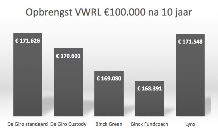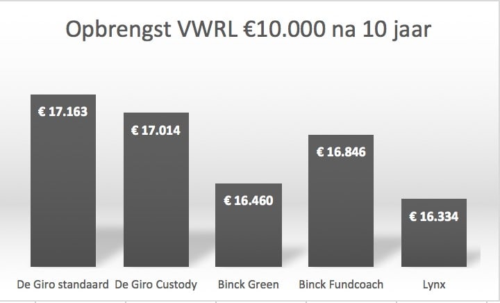 Indien je 10 jaar lang elke maand €500 inlegt in VWRL zien de opbrengsten via de diverse brokers er als volgt uit. Hierbij ga ik uit van een koerswinst van gemiddeld 4% per jaar en een dividend van 2% per jaar.