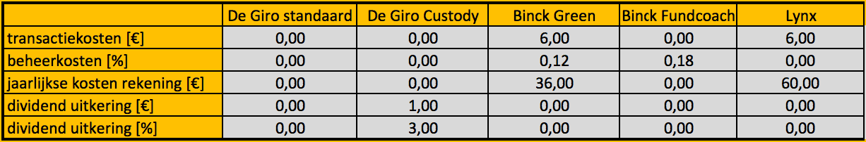Hieronder een overzicht van de nu geldende tarieven voor iemand die maandelijks €500 of eenmalig €10.000 in VWRL wil beleggen via de Nederlandse brokers DEGIRO standaard, DEGIRO Custody, Lynx, Binck Green of Binck Fundcoach: