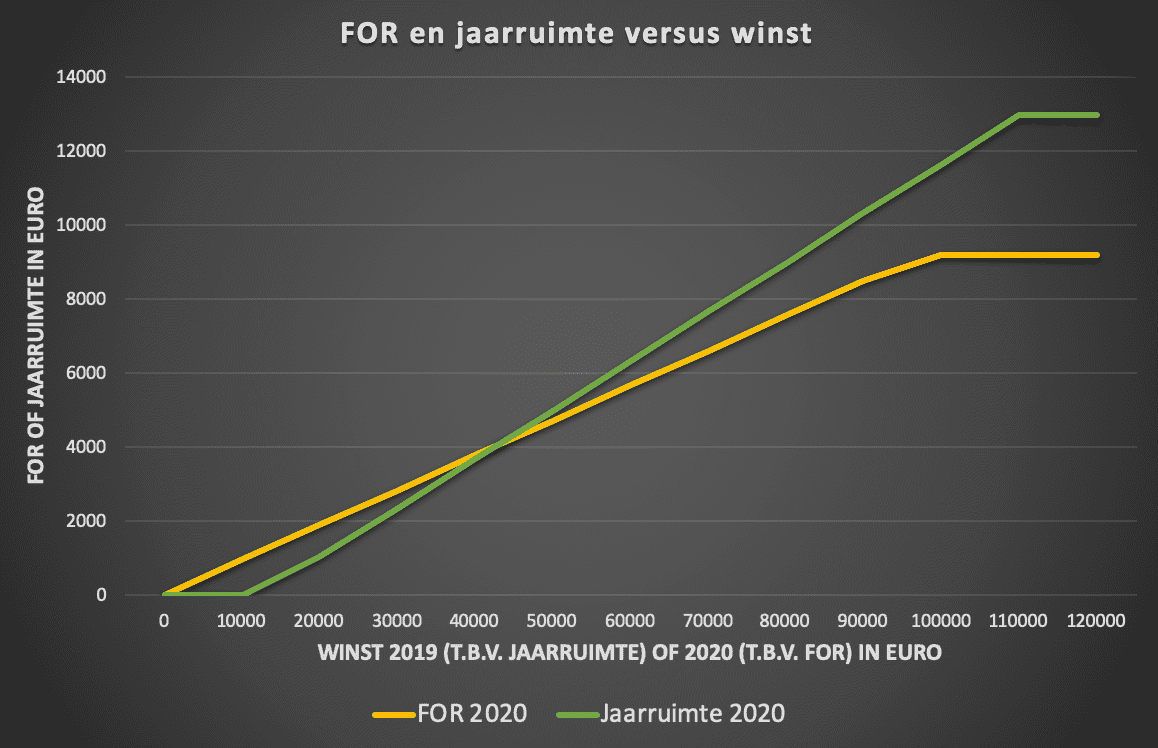 Hieronder heb ik in een grafiek weergegeven wat de oudedagsreserve (ik gebruik daar nog de oude afkorting FOR, oftewel Fiscale OudedagsReserve) in 2020 en de jaarruimte in 2020 zijn op basis van de winst over 2020 (FOR) en de winst over 2019 (jaarruimte).