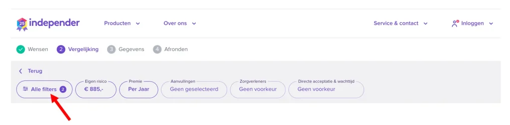 Op de resultaatpagina moest ik een aantel instellingen wijzigen om alle restitutiepolissen in volgorde van goedkoop naar duur zichtbaar te krijgen.